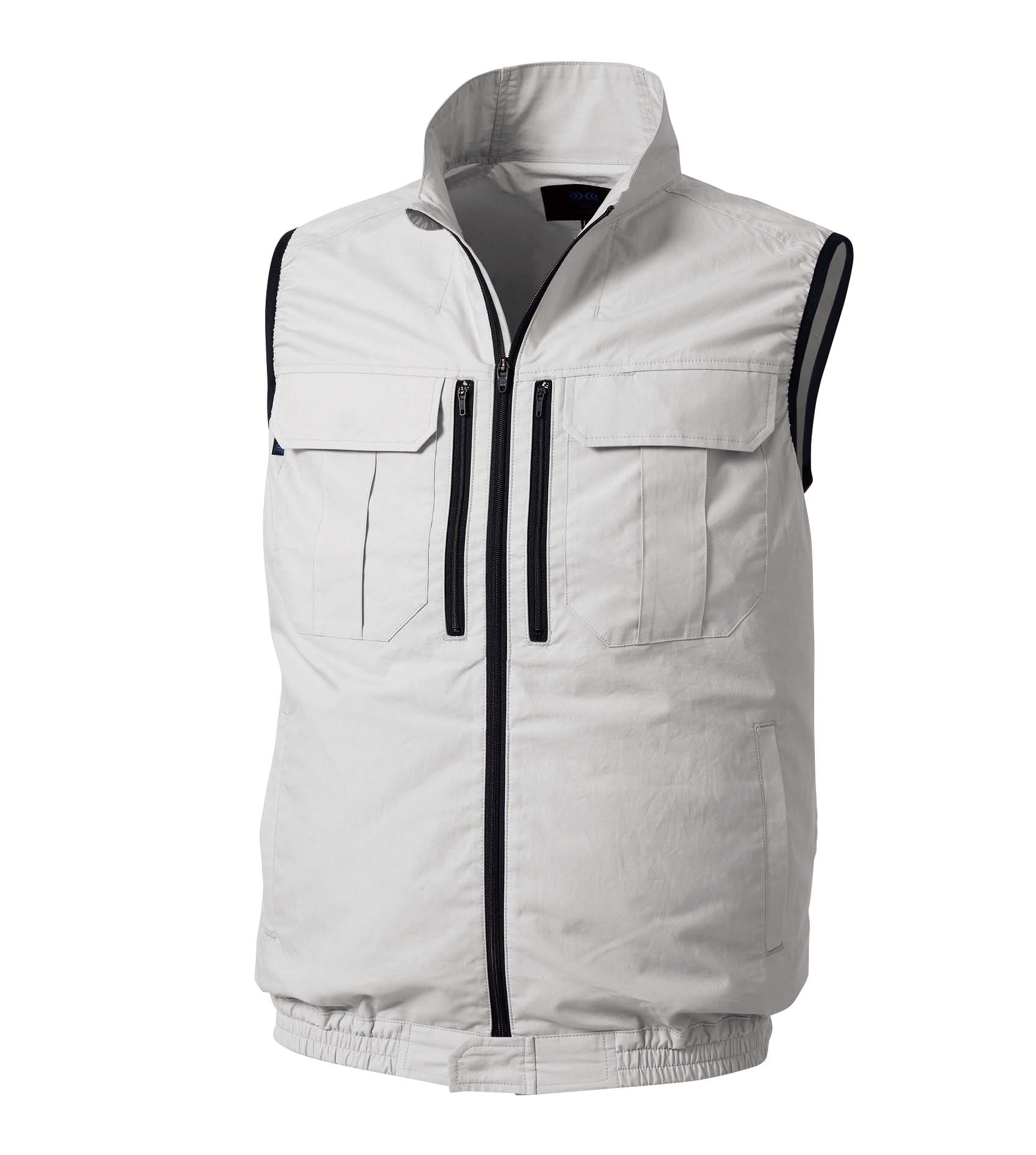 Fresh air drawn in from the two fans on the back vaporizes the sweat inside the garment, giving a cool sensation. The air does not leak from the fabric on its way, but flows steadily to the neck area and cuffs where it is discharged, taking in the sweat in the garment and discharging it.