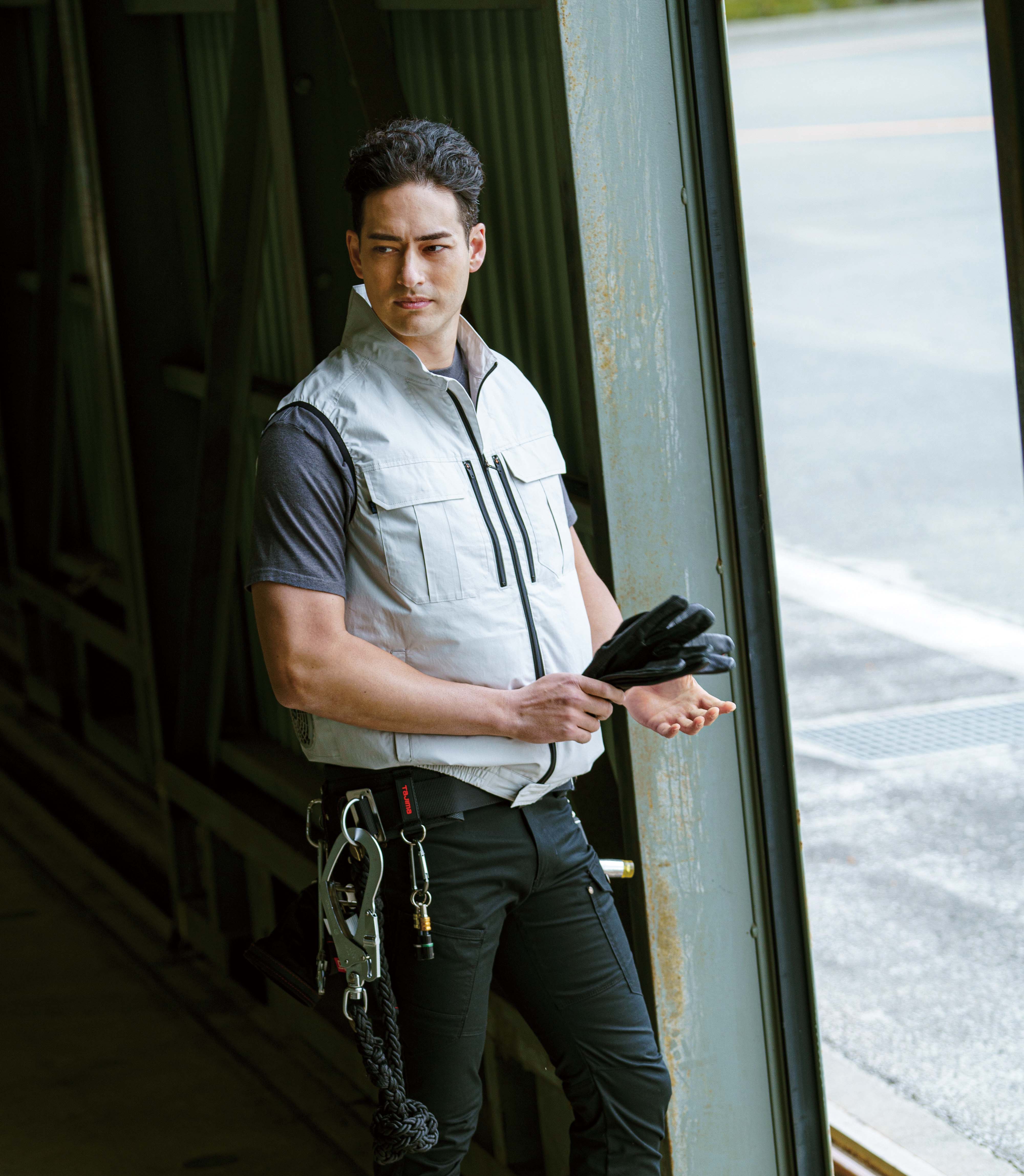 The Cooling Jacket incorporates a number of features in its design. By buttoning up the adjustment strap on the back of the neck, an "exhaust duct," i.e. an air vent is formed to facilitate the exhaust of sweaty air from the garment. At the same time, the air that gushes out cools the face and head area.