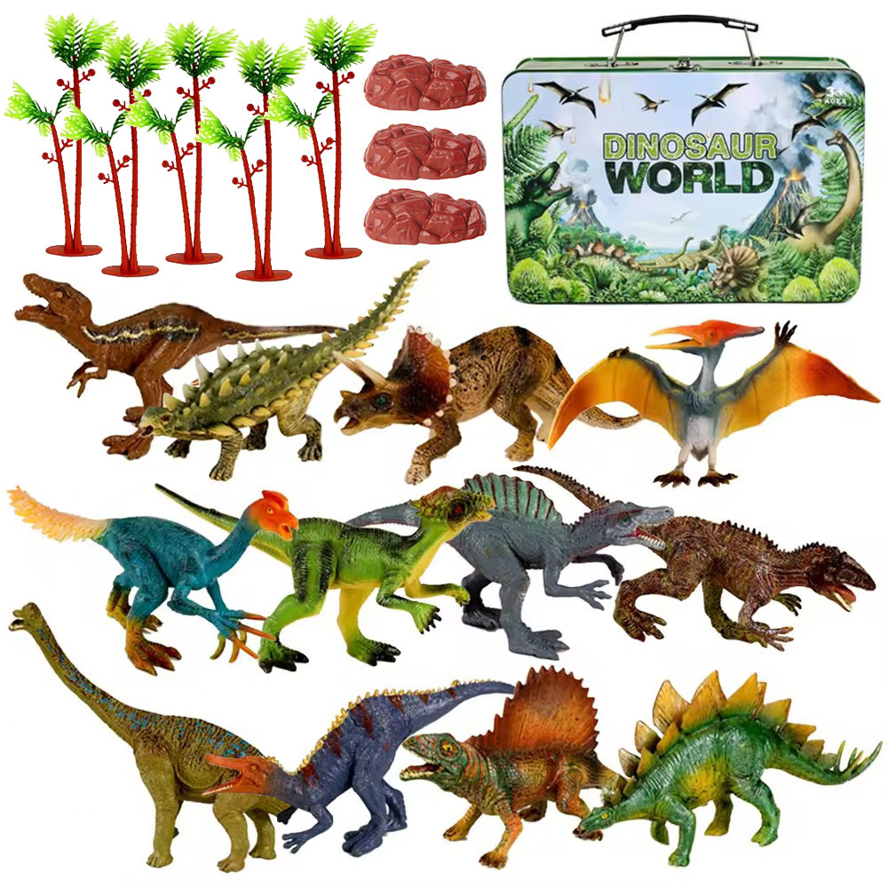 12pcs 7 inches dinosaur with tree and rock in the tin box