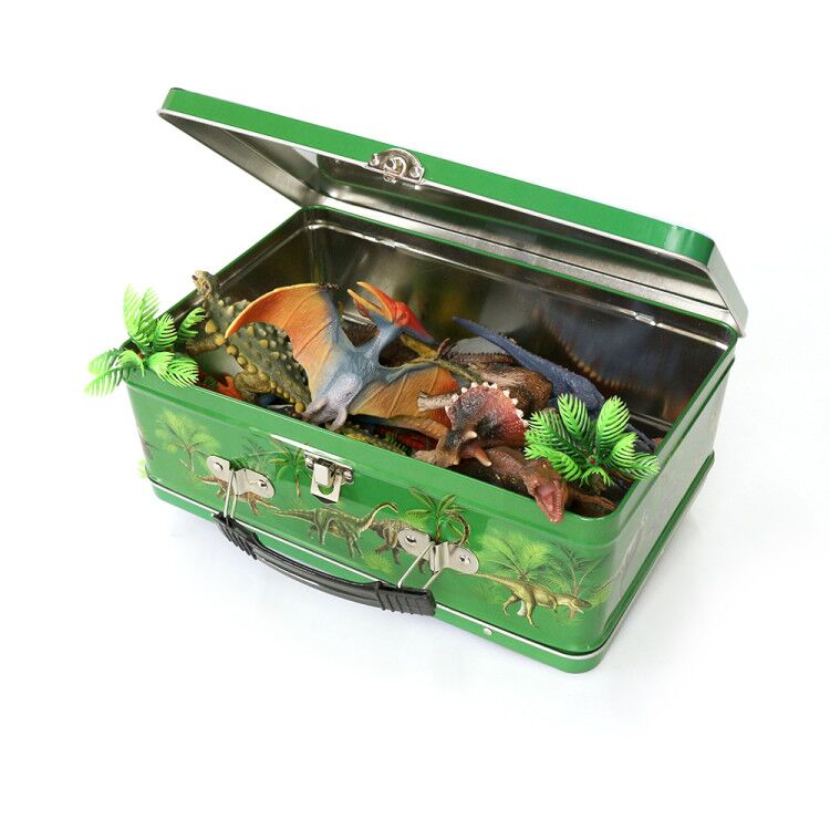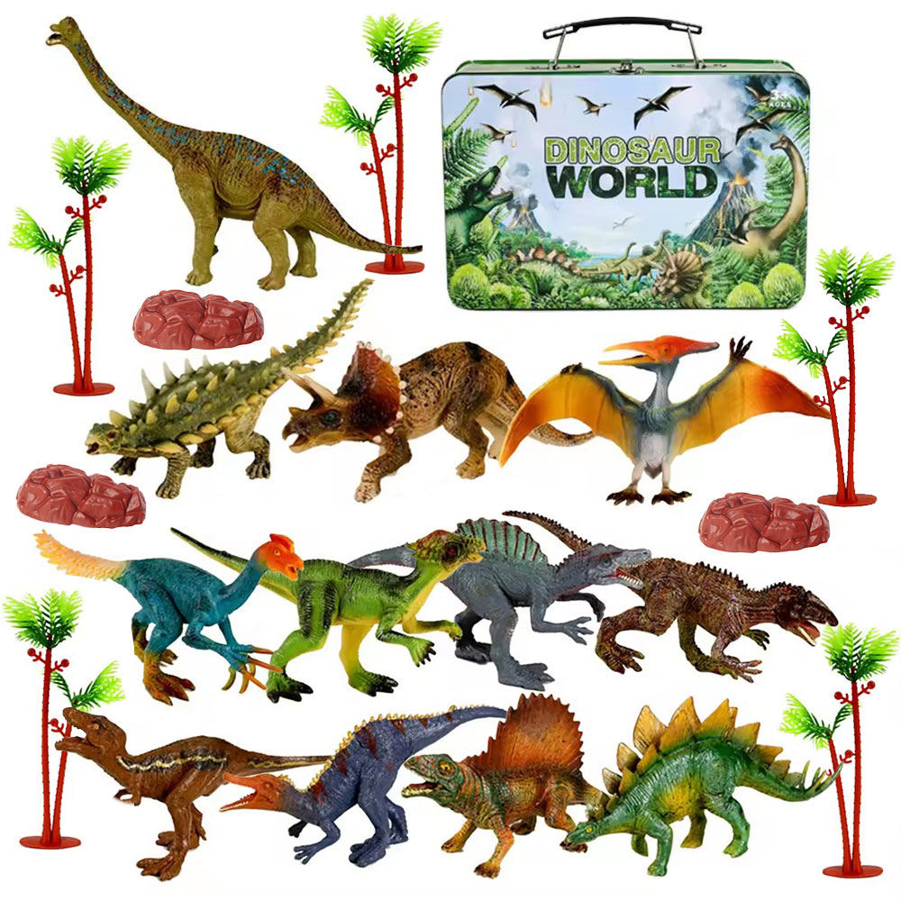 Juguetes many kinds mixed kids gift solid 7' PVC plastic dinosaur toy in tin portable box