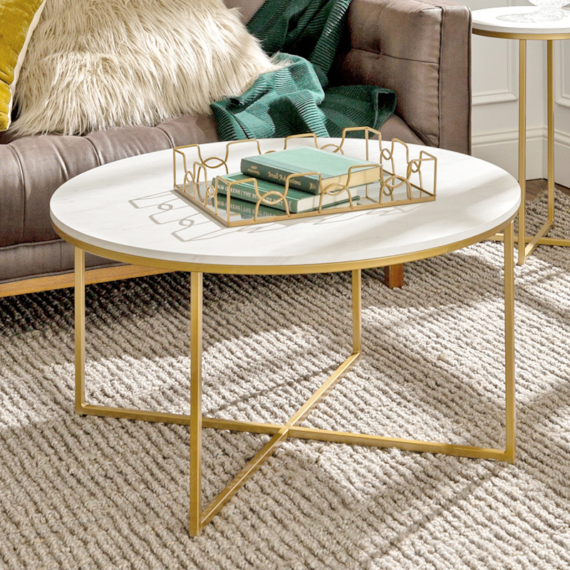 Luxury Nesting Gold Steel Metal Legs Frame End Table Coffee White Marble Top Coffee Tables