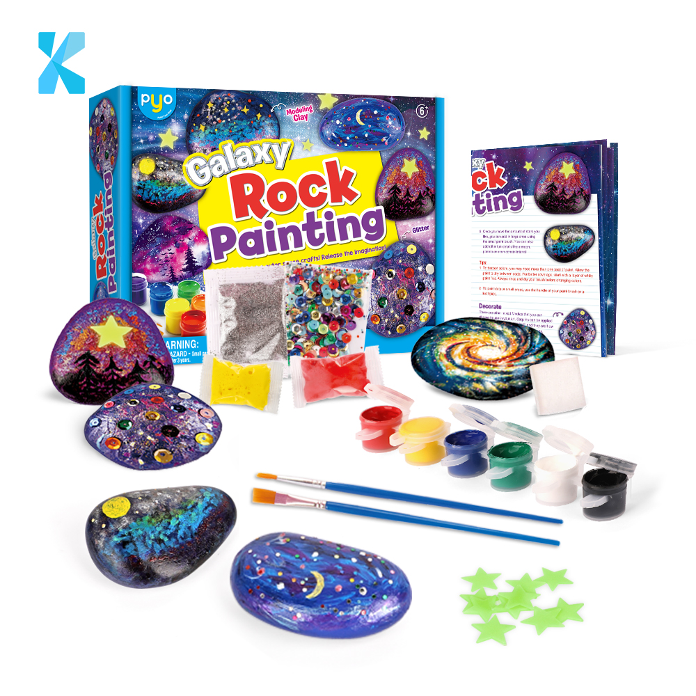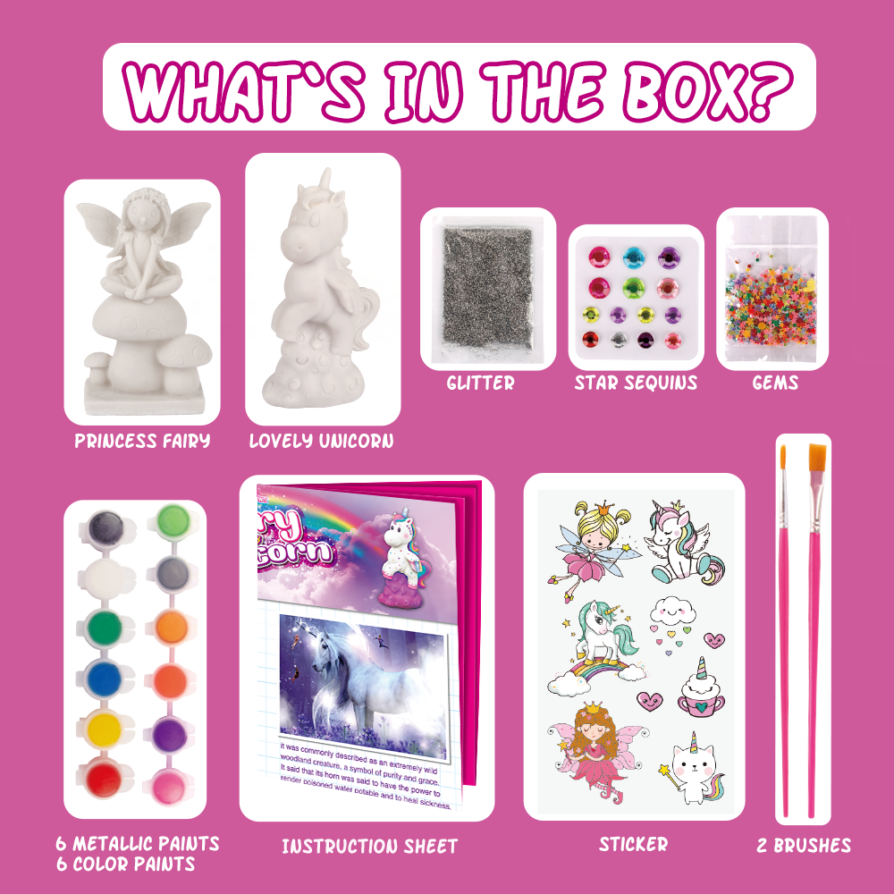 Contents | Unicorn & Fairy, 6 Color Paints, 6 Metallic Paints, 2 Brushes, Star Sequins, Sticker, Gems, Glitter, Instruction Sheet. |