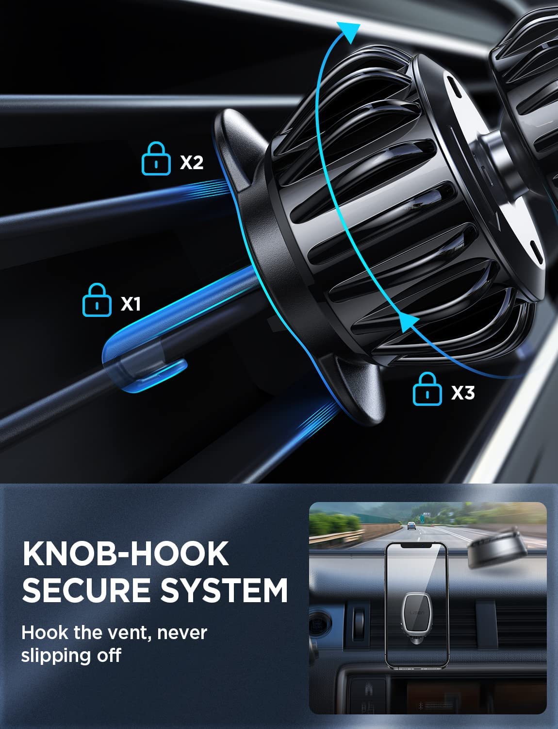 2.LOCK HORIZONTAL & VERTICAL VENT FIRMLY: The LISEN magnetic phone mount was designed with lengthened "Hook(1.41in)" ,which helps it to lock deeper vent blade and resolve the incompatible issue of VERTICAL VENT perfectly.