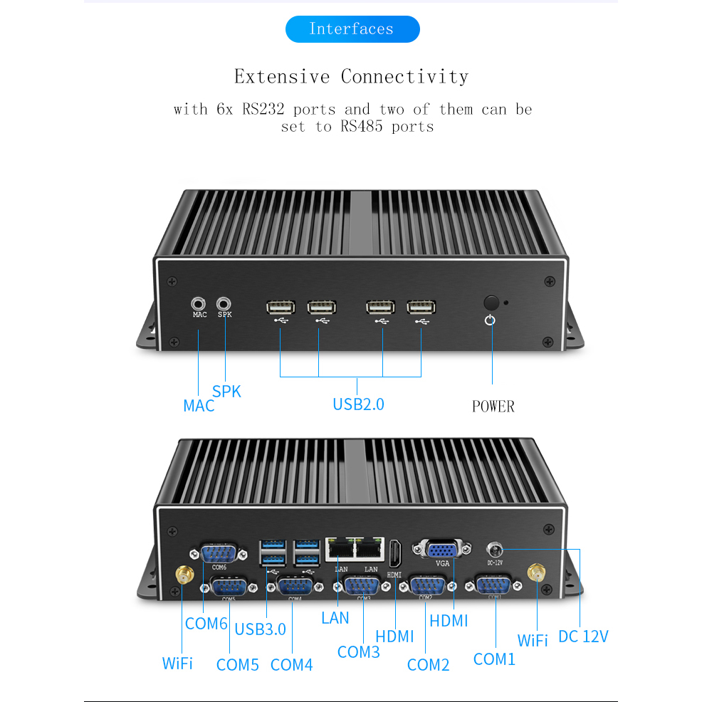 Package Content | 1x Mini PC 1x Power Adapter 2x WIFI antennas 1x SATA power & data cable (send by stock) 1x VESA mount 1x User Manual |