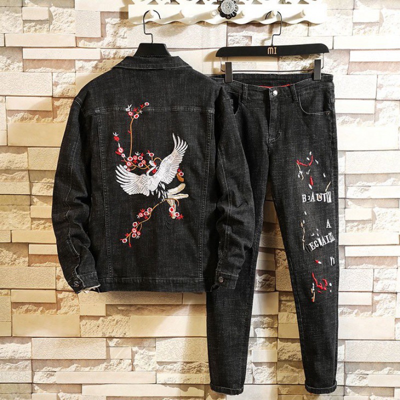Fashion Hot Selling Men's Denim Suit Custom Fitness Two Piece Set Men's Bicycle Denim Jacket And Jeans Fabric Casual Knitted