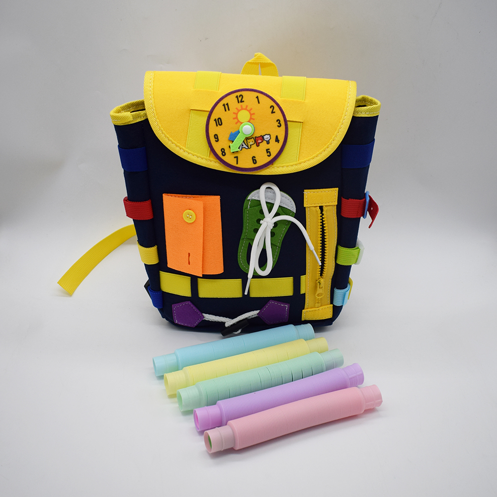 1.Sensory busy board helps kids learn basic life skills through playing. This sensory bag offers shoelaces, Zippers, belt buckles, buttons, jigsaw puzzles, alphabet, clock, calendar learning and letters from A to Z are all designed for small hands.