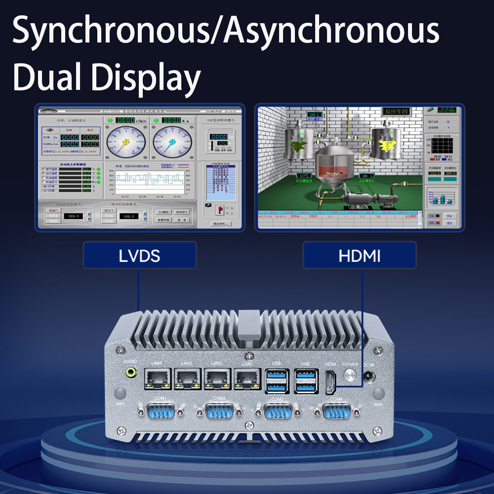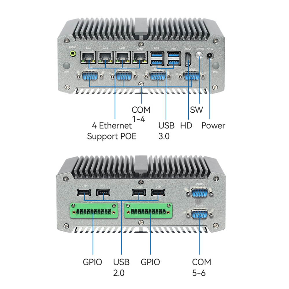 USB3.0*4、USB2.0*4, H-D-M-I*1、DC*1、COM *6 (COM1-2 support RS232/ RS485/ RS422), 1*GPIO