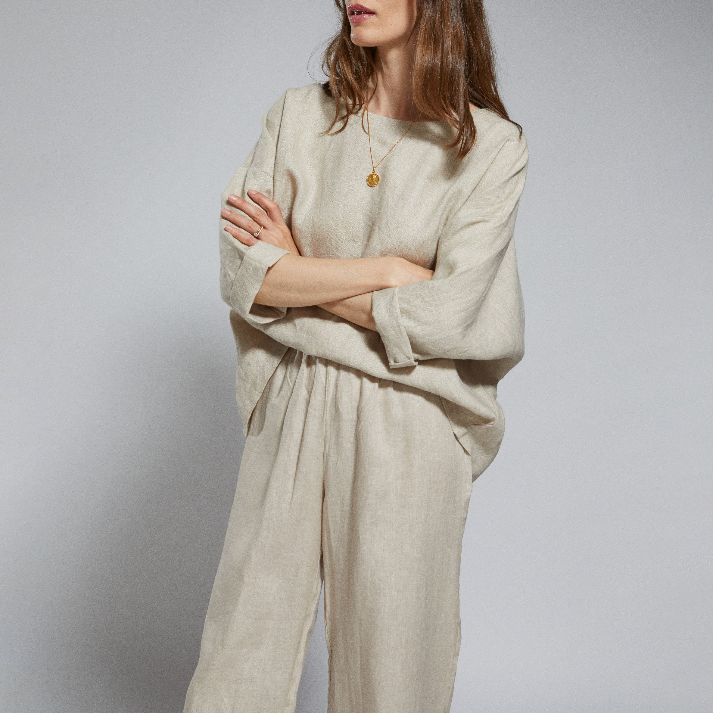 Designed in organic linen for sustainable style with soft flowing flare of the leg.