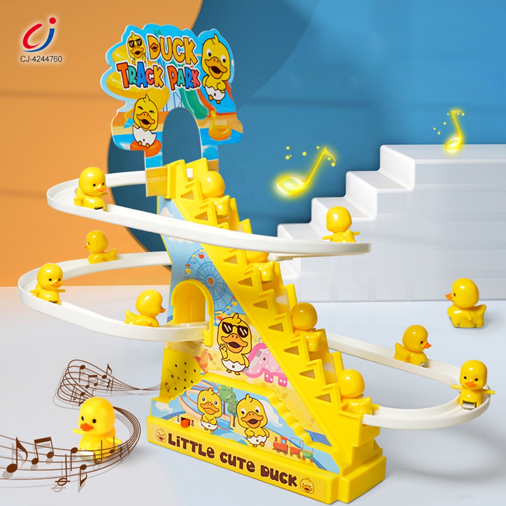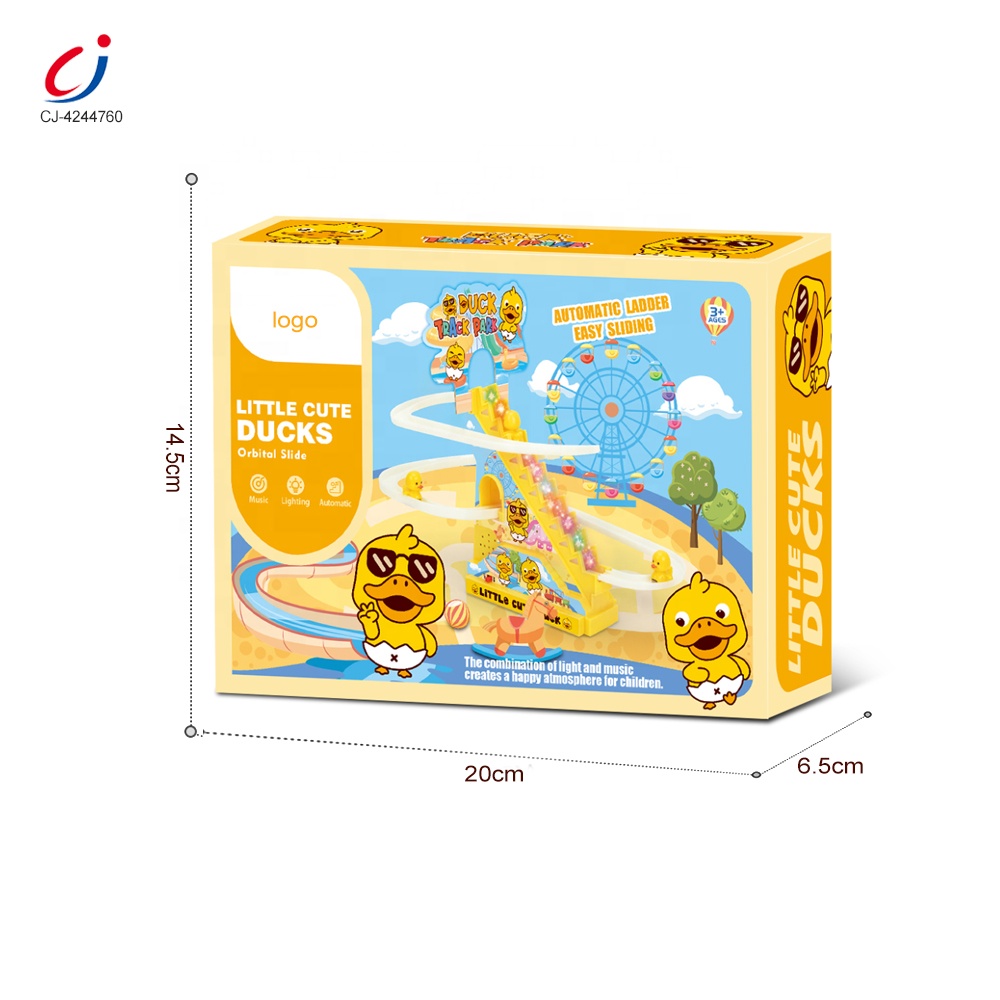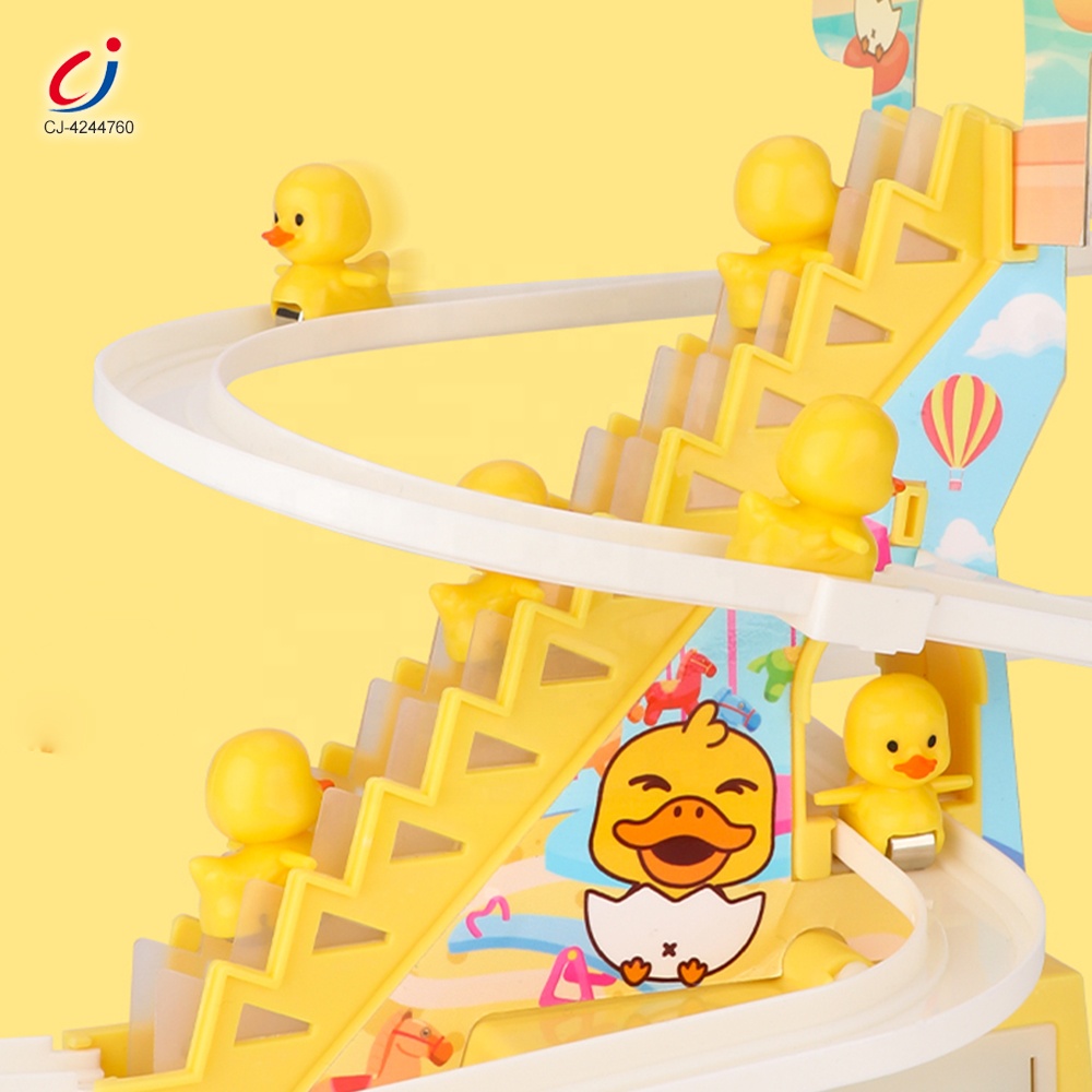 Chengji diy rail racing track electric small duck climbing stairs set educational battery operated lighting music duck slide toy