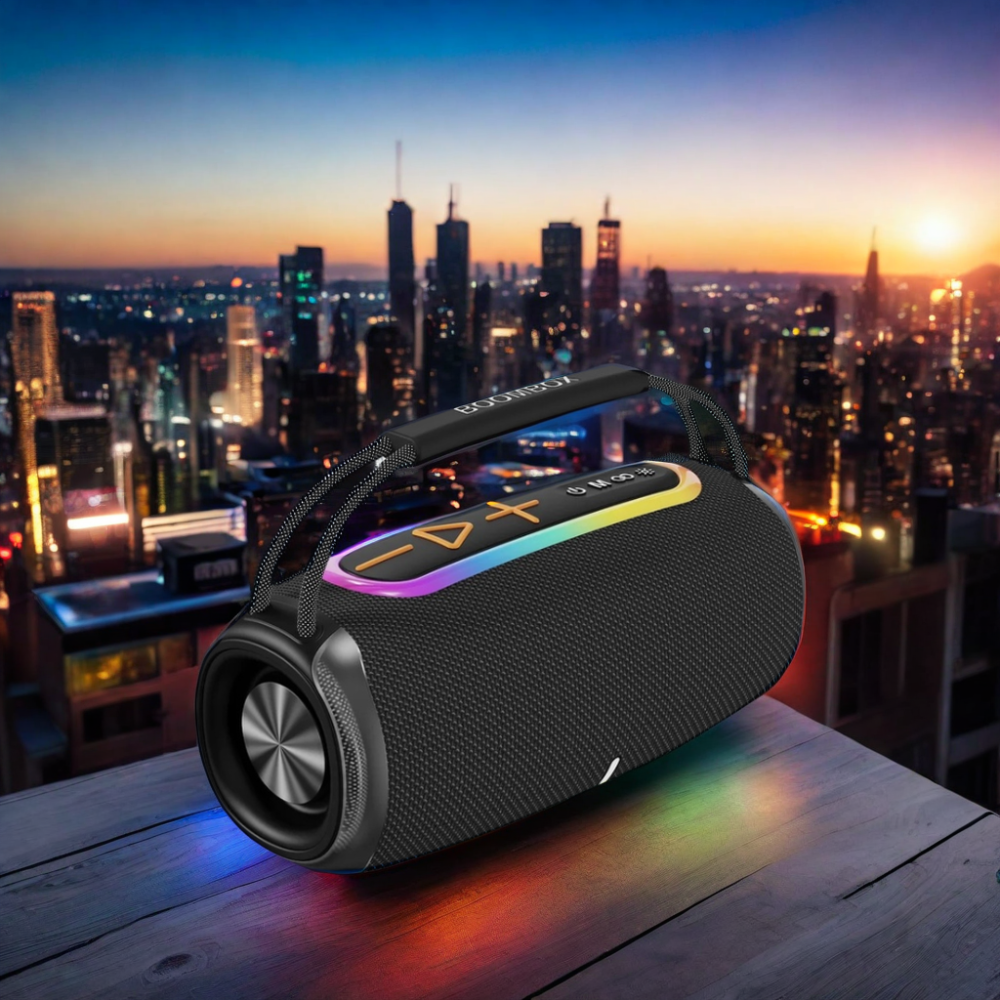 The BOOMBOX S680 combines sleek contours with a sophisticated technological aesthetic. Adding a modern touch to its design, this speaker features dynamic RGB lighting effects that synchronize seamlessly with the music's rhythm, providing users with an immersive auditory experience. Elevating its sound quality, the BOOMBOX S680 incorporates Bluetooth 5.0 technology for swift and stable signal transmission, ensuring an uncompromised audio fidelity. With its potent 20W high-power driver, the speaker not only delivers impressive volume but also utilizes a unique passive diaphragm design to extend the low-frequency range, intensifying the emotional impact of the music with a powerful subwoofer. Facilitating TWS series connection, it achieves an authentic stereo effect, enabling users to revel in a 3D surround subwoofer experience within the confines of their homes.