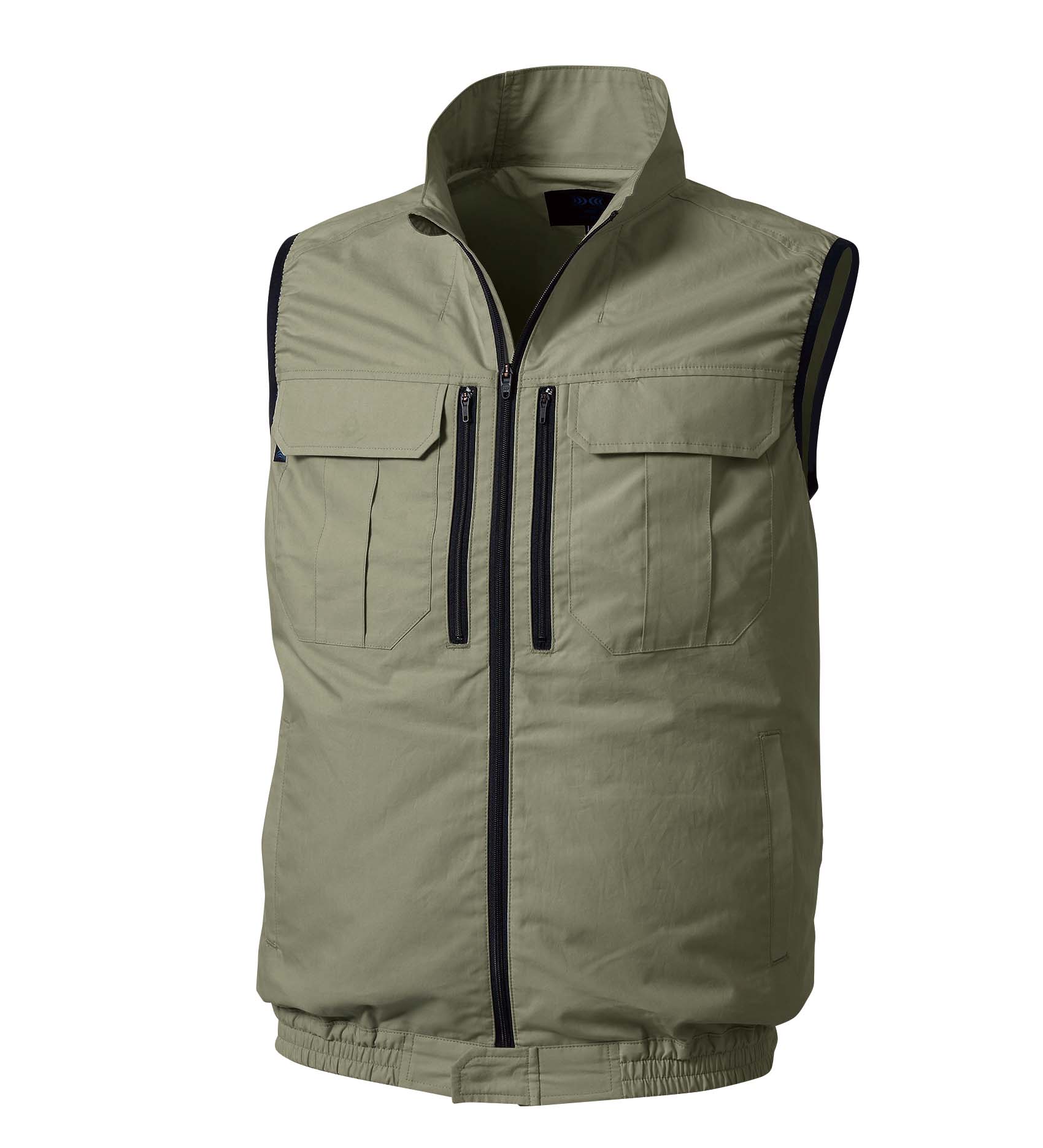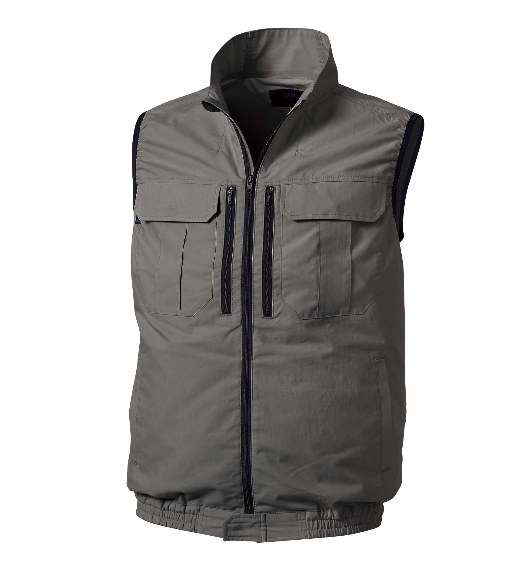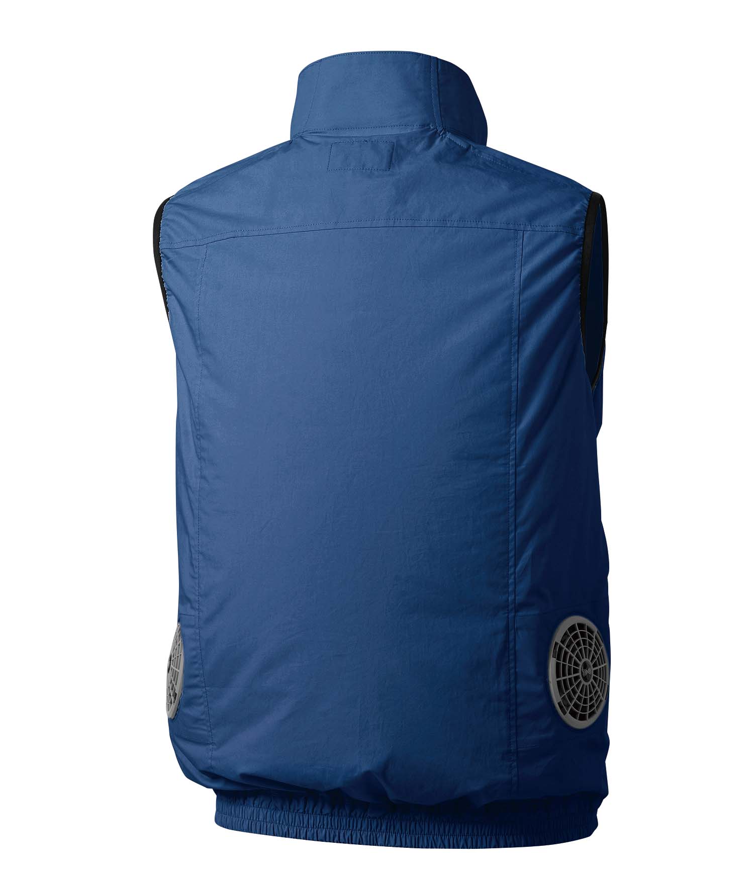 Fresh air drawn in from the two fans on the back vaporizes the sweat inside the garment, giving a cool sensation. The air does not leak from the fabric on its way, but flows steadily to the neck area and cuffs where it is discharged, taking in the sweat in the garment and discharging it.