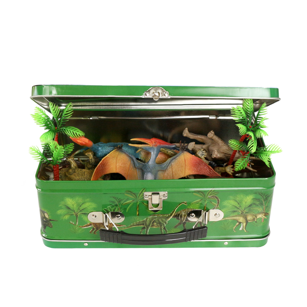 Juguetes many kinds mixed kids gift solid 7' PVC plastic dinosaur toy in tin portable box