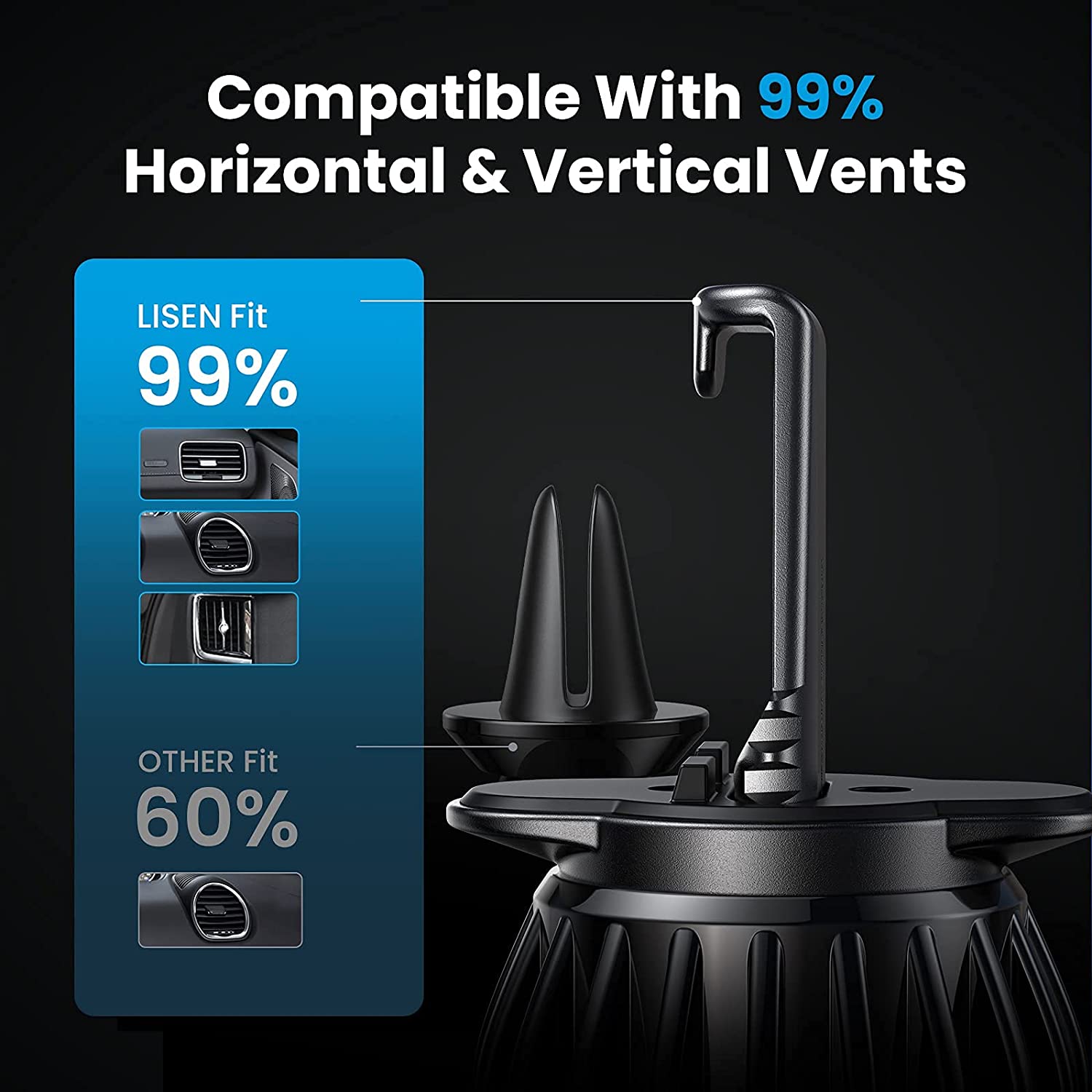 2.LOCK HORIZONTAL & VERTICAL VENT FIRMLY: The LISEN magnetic phone mount was designed with lengthened "Hook(1.41in)" ,which helps it to lock deeper vent blade and resolve the incompatible issue of VERTICAL VENT perfectly.