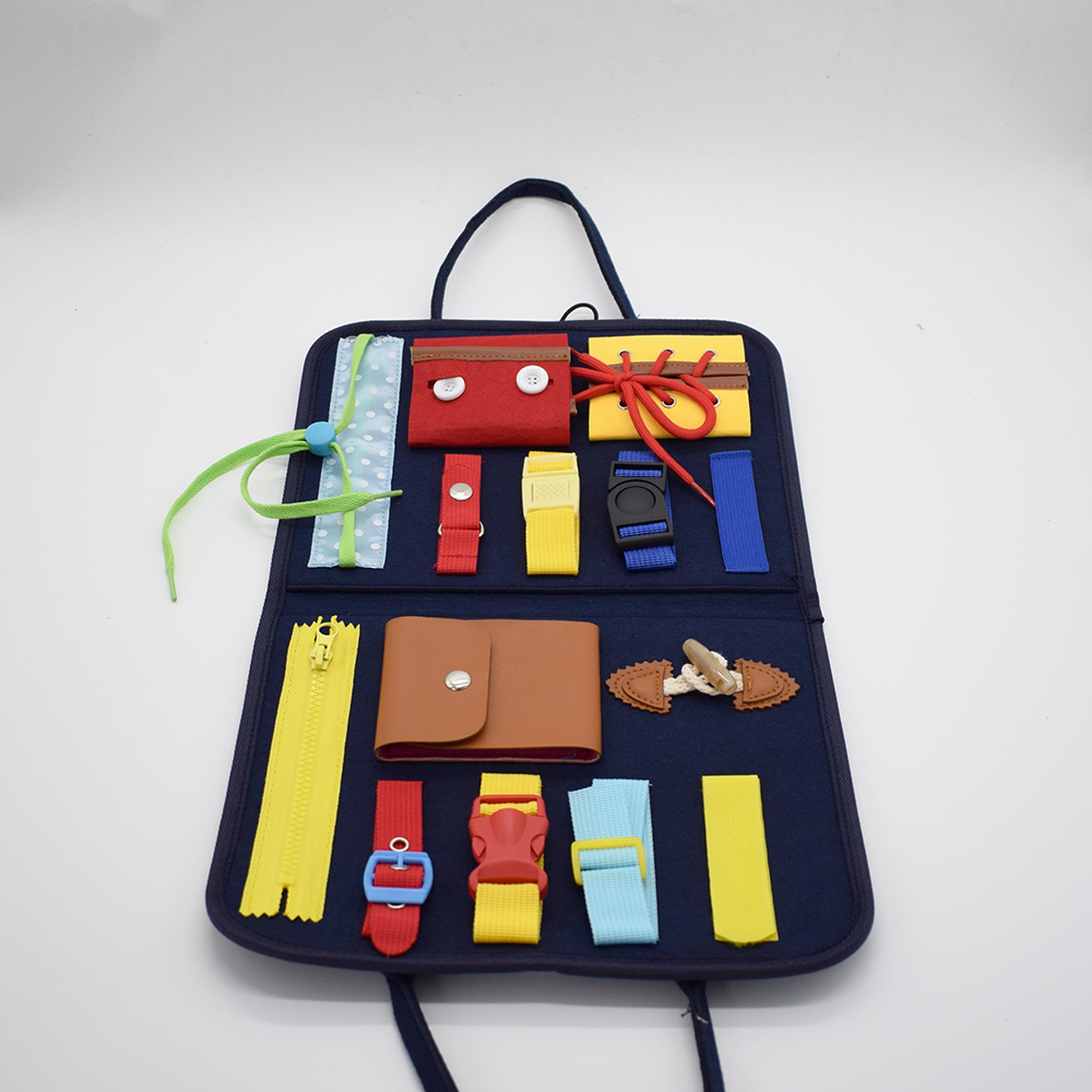 1.Sensory busy board helps kids learn basic life skills through playing. This sensory bag offers shoelaces, Zippers, belt buckles, buttons, jigsaw puzzles, alphabet, clock, calendar learning and letters from A to Z are all designed for small hands.