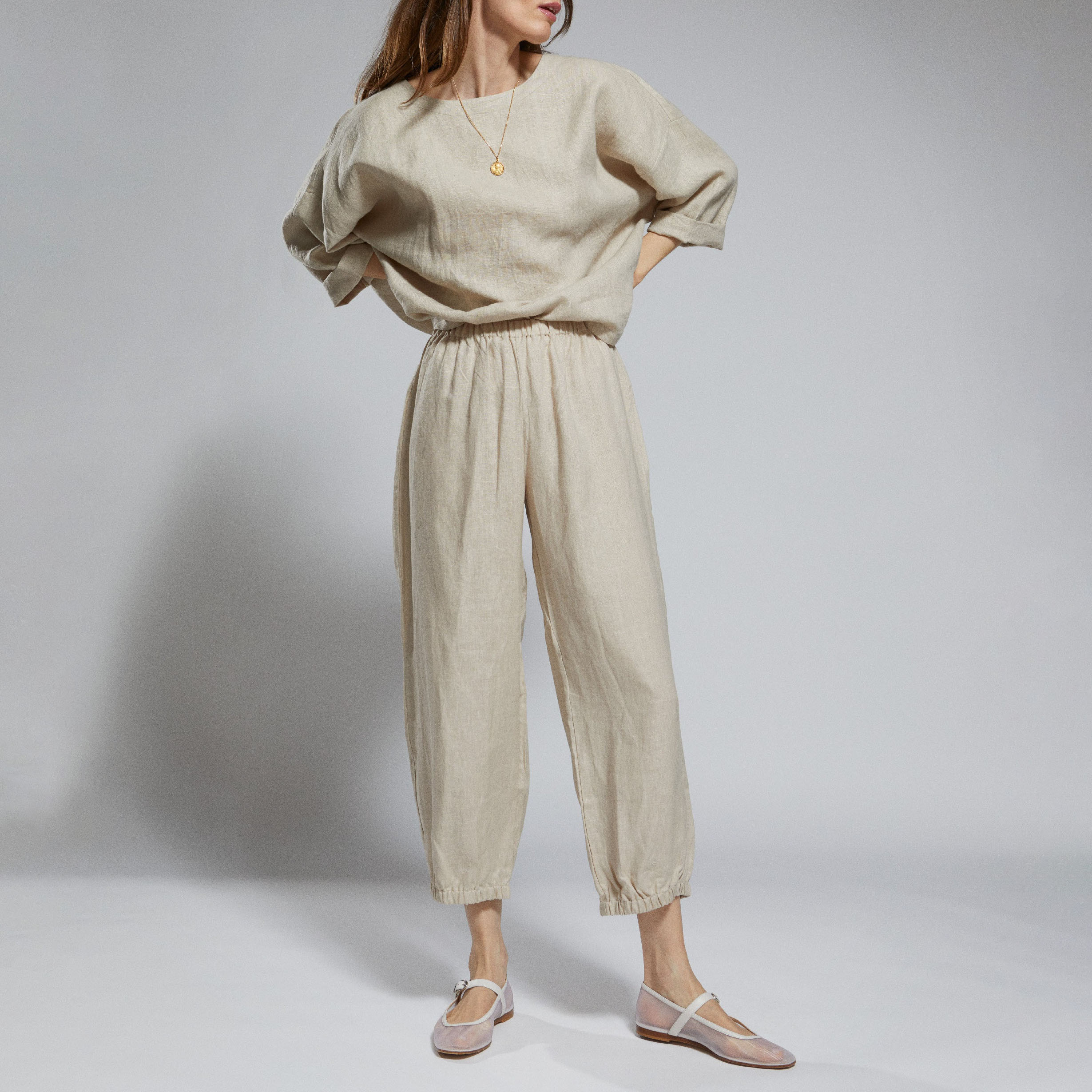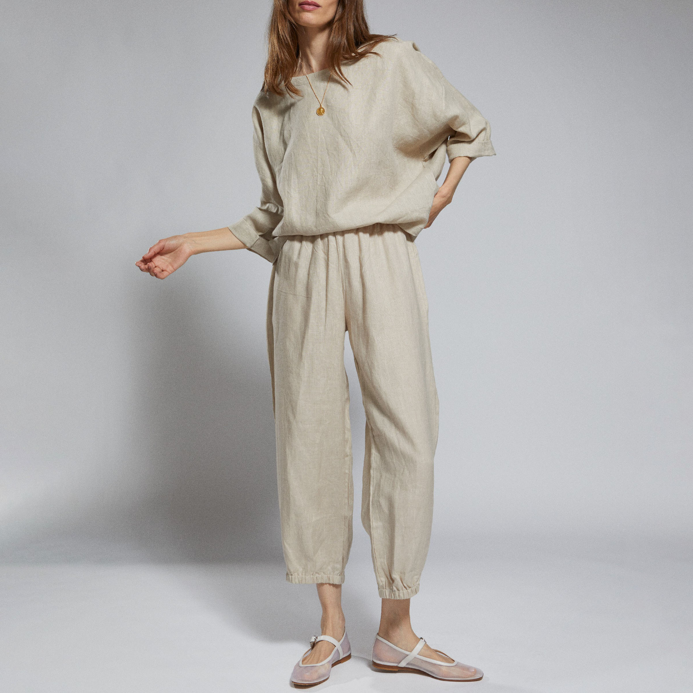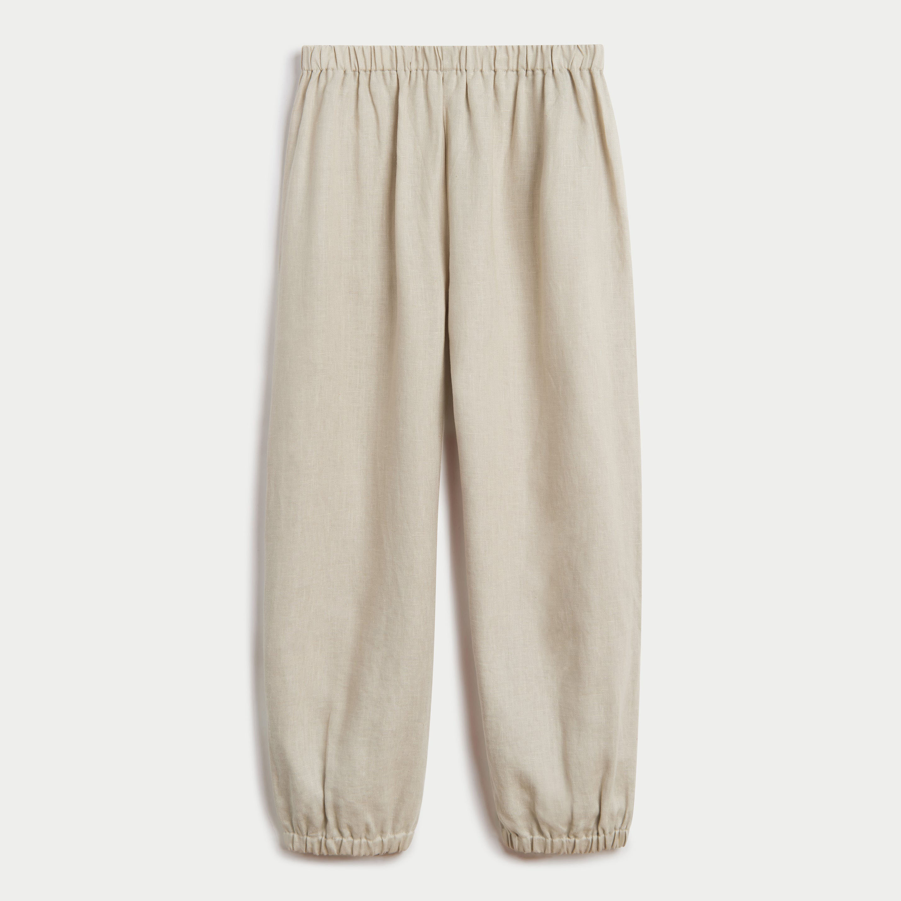 Designed in organic linen for sustainable style with soft flowing flare of the leg.