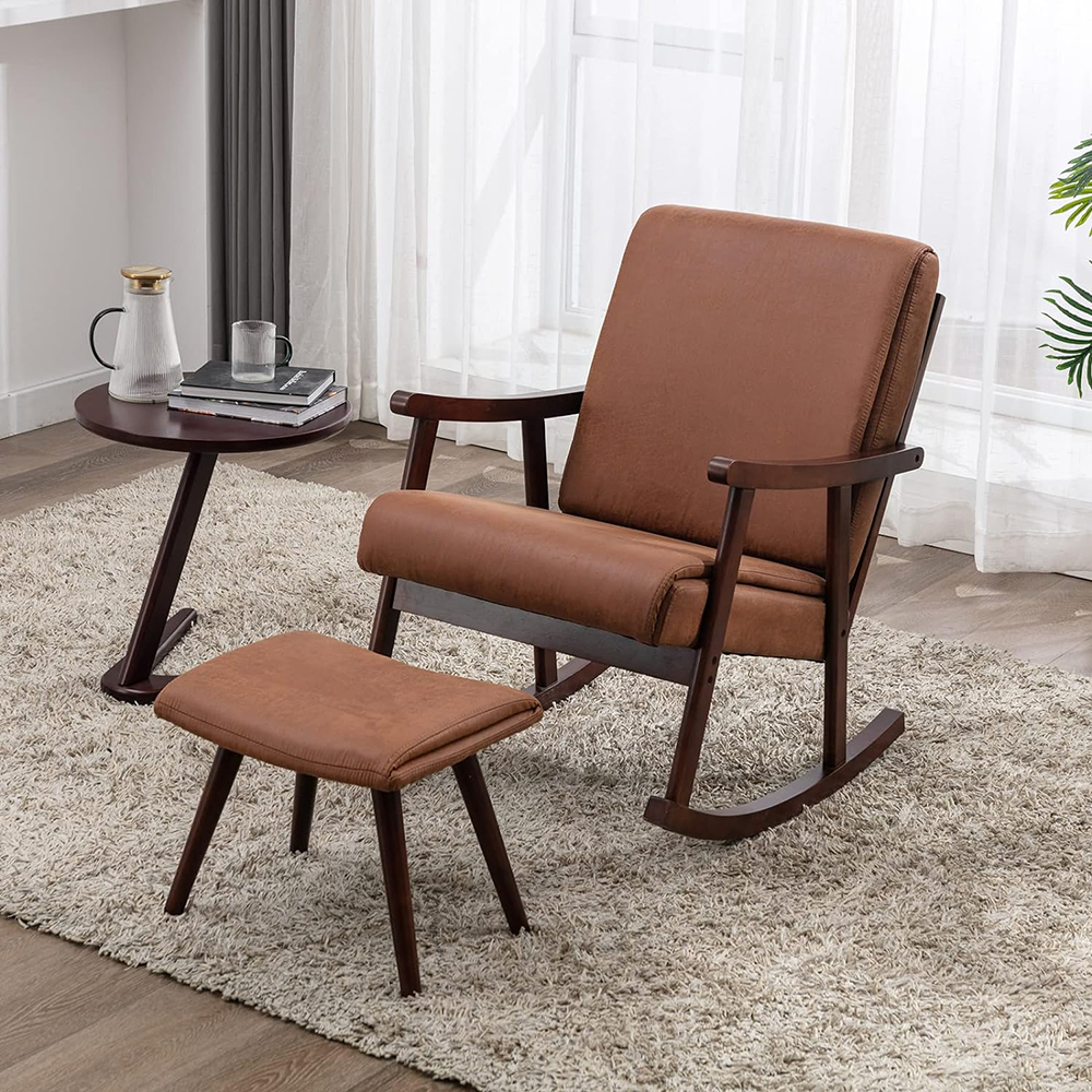 * 【Comfy & Sturdy】 Supportive seat and back cushion covered with skin-friendly leather/fabric combined with ergonomic back and armrest design enabling an impressive sitting experience. Moreover, selected premium solid wood for this glider chair ensures a sturdy and durable base and frame, which can hold up to 330 LBS.