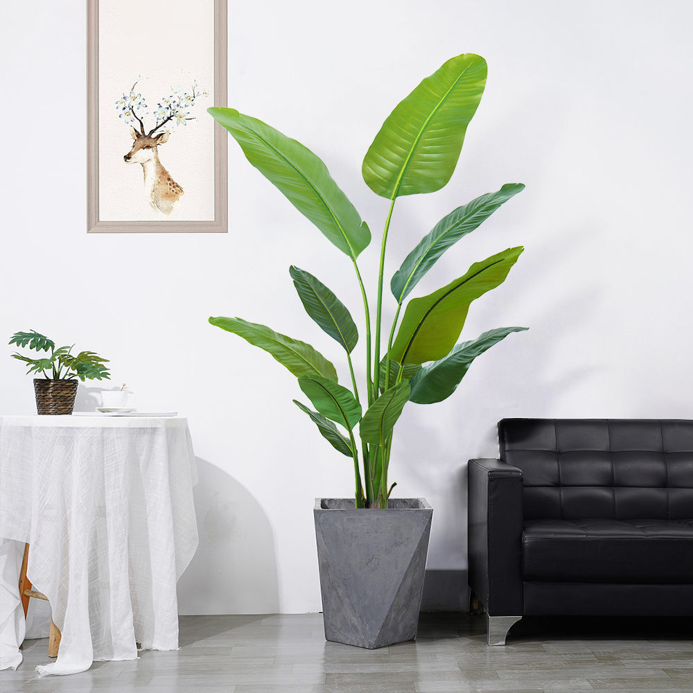 Material | 1).Leave: silk fabric, PE can be anti-UV plastic, or fire-retardant foliage 2).Trunk: plastic sculpted stem 3).Base: Our standard base is a plastic pot or steel plate |