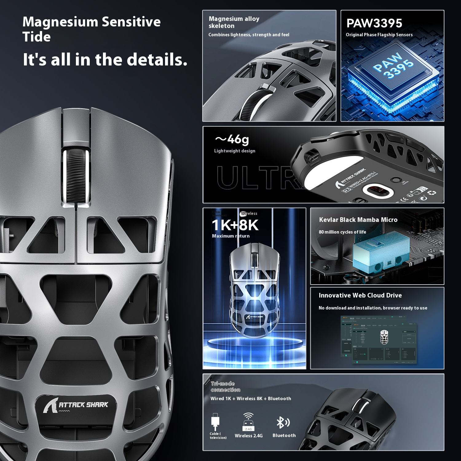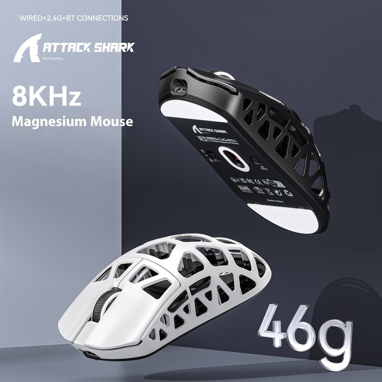 Attack Shark R3 Magnesium PAW3395 Alloy Mouse Lightweight 4K8K Esports Gaming RGB Backlit Three-Mode Bluetooth USB Connection